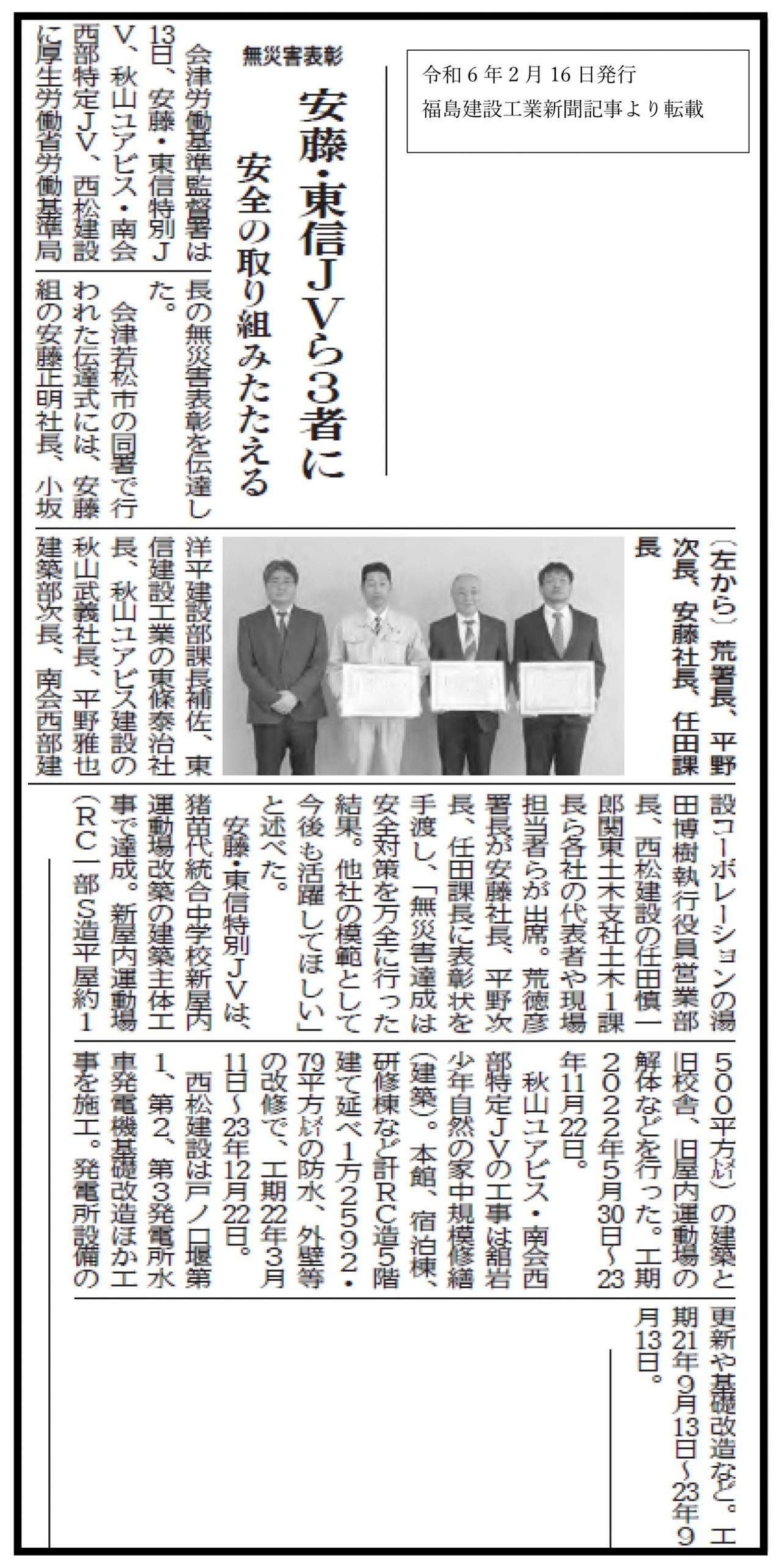 2024年2月26日2024年2月26日 「建設事業無災害」の表彰を受けました 秋山ユアビス建設株式会社様と当社で結成した、秋山ユアビス・南会西部特定共同企業体による「舘岩 少年自然の家・中規模修繕(建築)工事」において厚生労働省労働基準局長より「建設事業無災害」の 表彰を受けました。 ついては令和6年2月14日に会津労働基準監督署にて伝達交付式が行われ、表彰状をいただきました。 ※令和6年2月16日発行 福島建設工業新聞 に掲載されました。