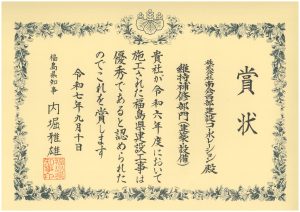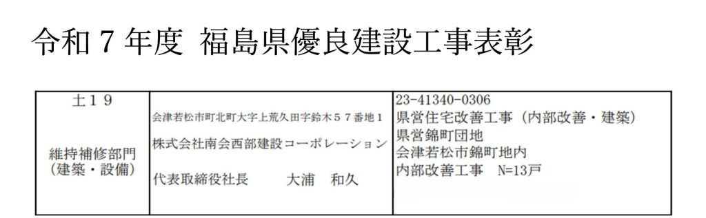 2025年10月3日 令和7年度 福島県優良建設工事表彰を受賞 令和7年9月10日 【令和7年度 福島県優良建設工事表彰】 維持補修部門(建築・設備)において優良建設工事表彰を受賞いたしました。 工事にご協力いただきました関係者の皆さま、地域の皆さまに感謝を申し上げると共に、 社員一同、改めて気を引き締めより一層の安全に努めながら、 この会津での建築・土木工事に邁進してまいります。